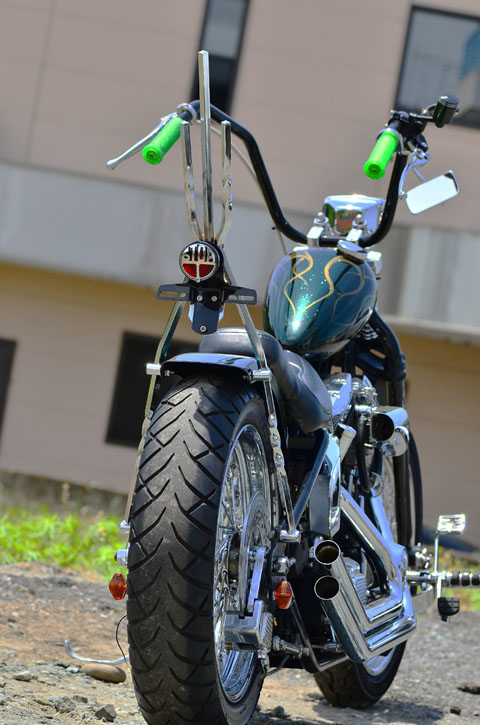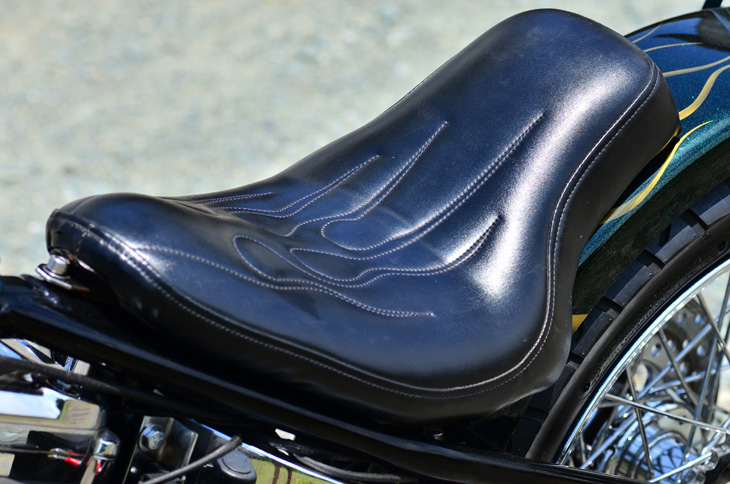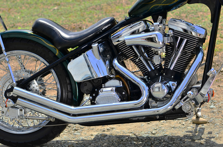 純正のエボリューション・モーターをシンプルなリジッドフレームに搭載し、マスタングタンク、6インチフラットフェンダー、ソロシート、アップスイープマフラーといったチョッパーパーツで組み上げた一台。そのコンセプトは「80年代のチョッパースタイル」。タンクとフェンダーに描かれたペイントもどこか懐かしさすら感じる細いタッチのフレイムスパターンで、マシンのイメージとも相性抜群の仕上がりである。