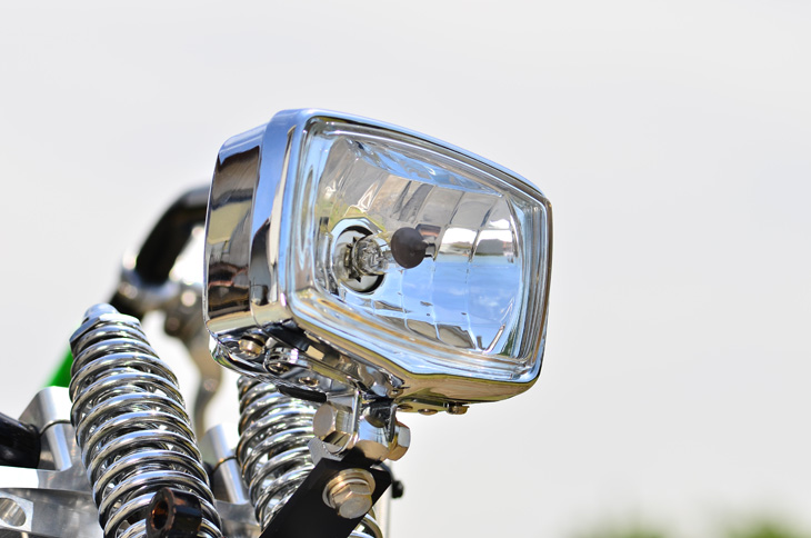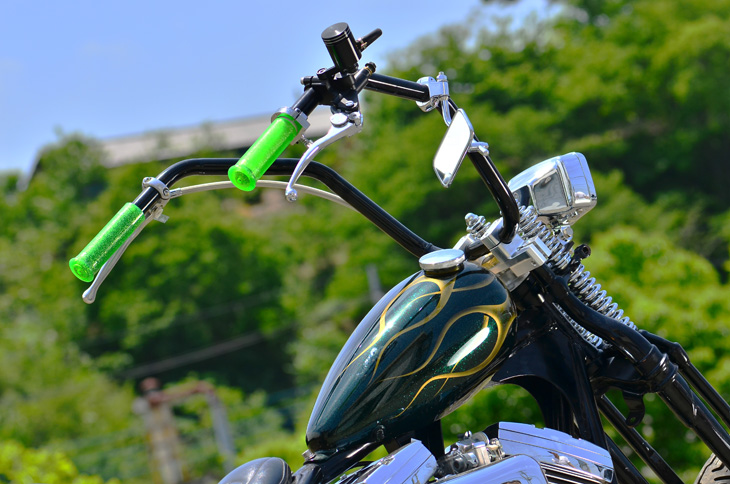特に目を引くのは、ブラックアウトされたオリジナルの6ベントハンドルと、絶妙にツイストされたシッシーバーだ。バイク単体で見てもそうなのだが、さらに人間が跨ったその姿は、まさに圧巻のインパクトである。また、前後共にしっかりとしたディスクブレーキなのもポイント。ここら辺のパーツチョイスも流石である。もちろん、ビレットパーツをあえて使用していないのもポイントなのだ。